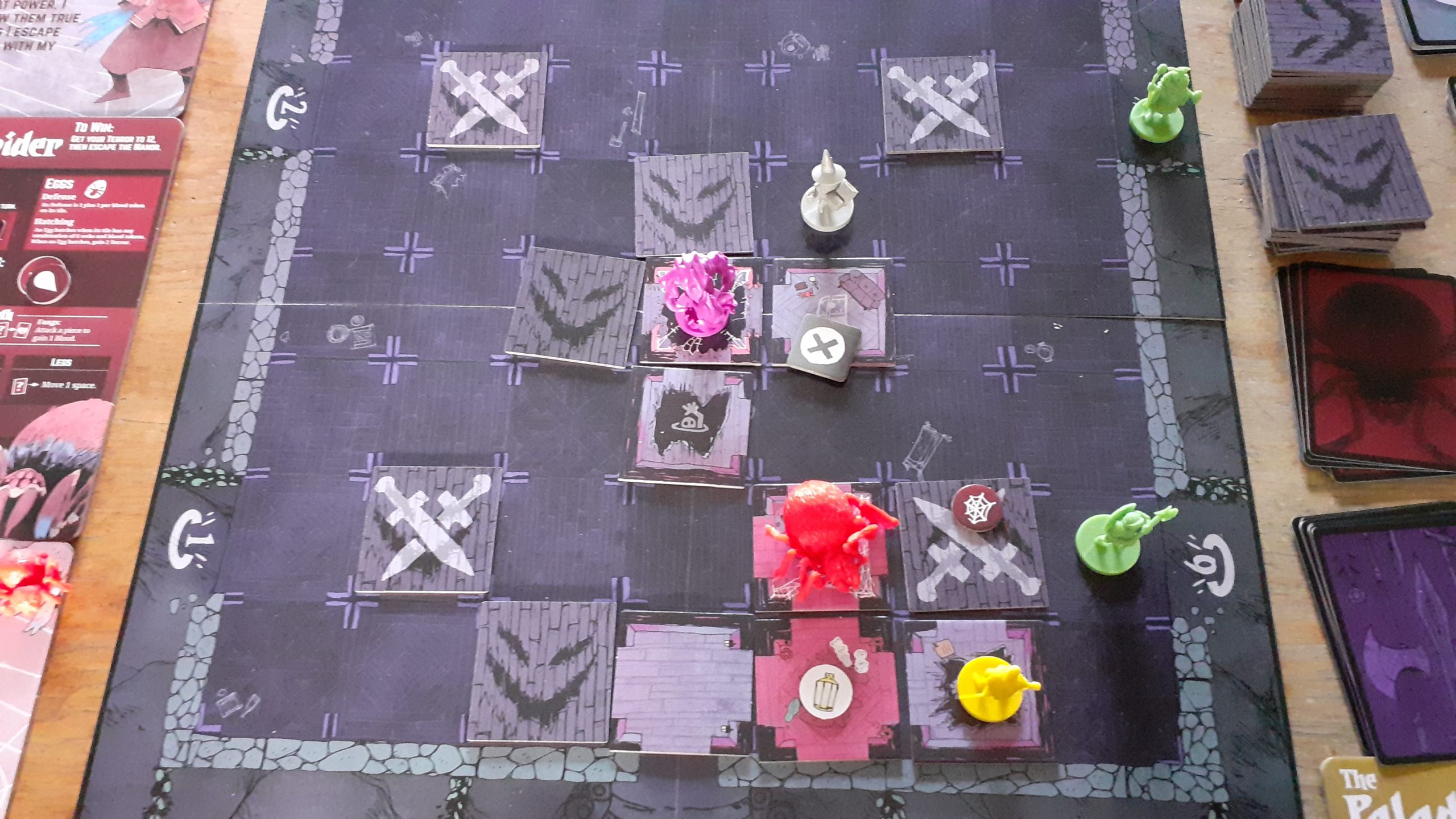 In Vast: The Mysterious Manor nemen 2-5 spelers het tegen elkaar op. Er is ook een solomodus, maar die hebben wij niet gespeeld voor de review. Iedereen speelt iets anders, en dat zit nog veel dieper dan wat speciale krachten. Elk personage (of groep aan personages) speelt volgens een volledig andere mechaniek. De spin, bijvoorbeeld, kiest elke beurt welke van de drie vormen ze aanneemt, en neemt vervolgens acties door handkaarten te spelen. De skeletten zijn niet een, maar vijf personages die elk apart een loopactie en een speciale actie hebben.