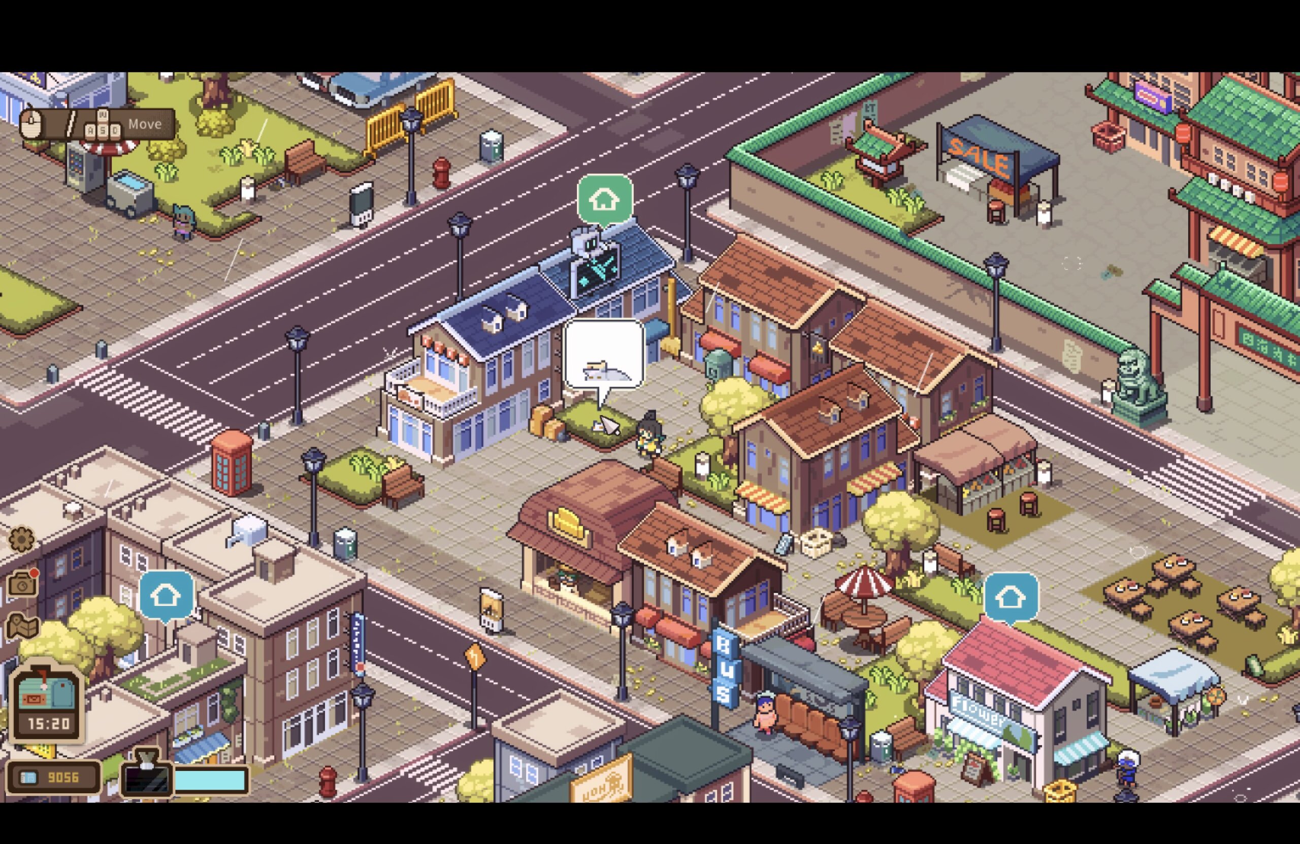 Wat erg leuk is, is hoe levendig de wereld zelf aanvoelt. Tijdens het rondlopen zal je dozen tegenkomen met nieuwe meubels, ontdek je verborgen hoekjes en krijg je kleine verrassingen. Zelfs zwerfkatten kun je aaien. Elk object reageert anders, vaak met een grappige opmerking als je eroverheen gaat, en juist die details geven Whisper Town zoveel charme. De pixelstijl past perfect bij de cozy sfeer. Alles ziet er warm en kleurrijk uit, alsof je in een knusse, vertrouwde wereld rondloopt.