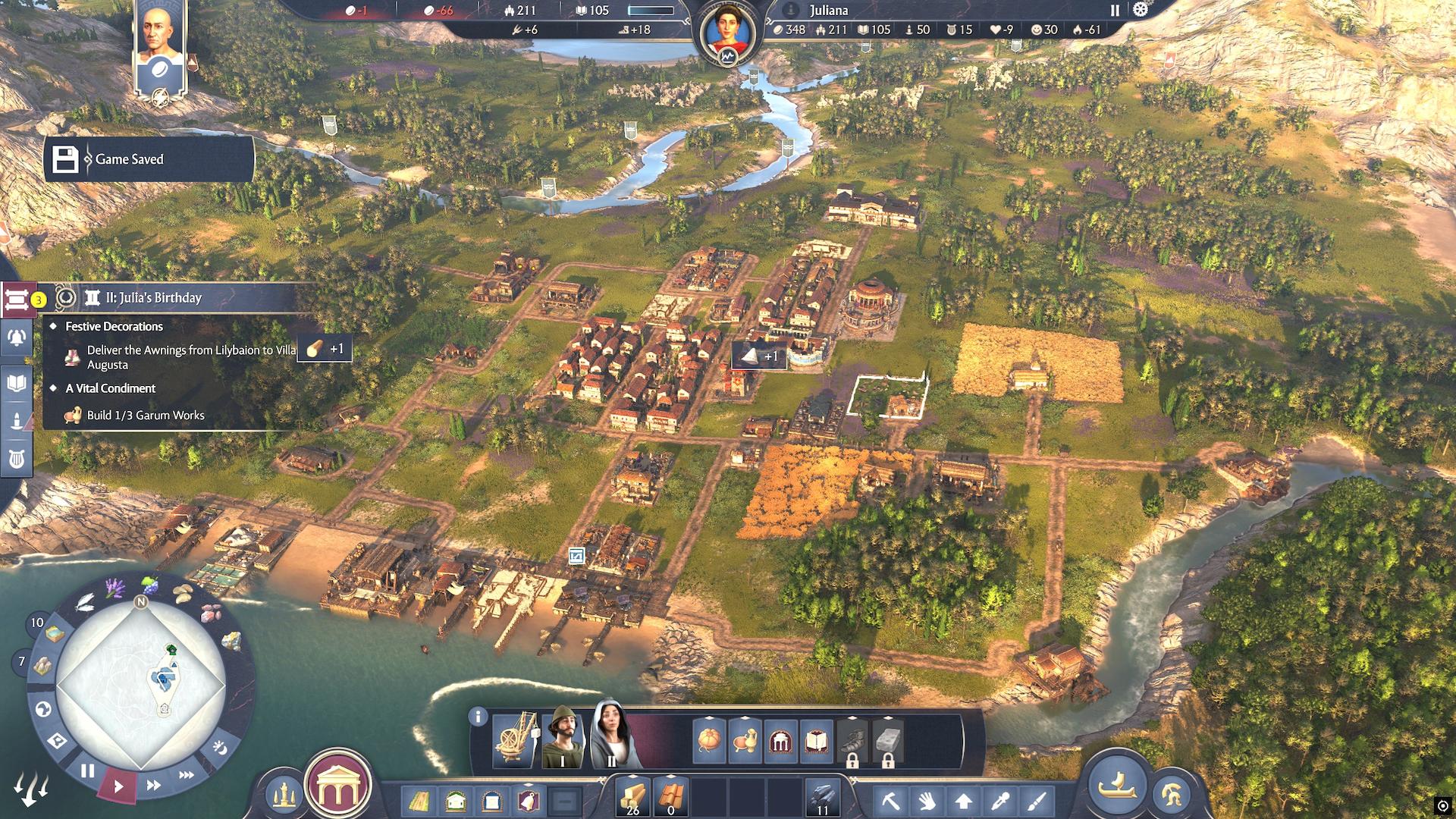 Fijn aan de verhaalmodus is dat de campaign lekker ontspannen is. Het is de perfecte manier om het spel te leren kennen. Dit komt deels omdat er een verhaal aan gepaard gaat. Dit is geen groots verhaal en het is nooit al te spannend, maar het zorgt ervoor dat je lekker in de sfeer van het oude Romeinse Rijk komt te zitten en het geeft je kleinere doelen om je op te richten. De keizer viert een feest voor de verjaardag van zijn vrouw, dus zorg dat je genoeg garum (vissaus) aan het produceren bent. Deze kleine doelen zorgen ervoor dat je al spelenderwijs de kneepjes van het vak leert. Dat is erg prettig, want games als Anno staan er bekend om om enorm overweldigend te zijn voor nieuwe spelers.