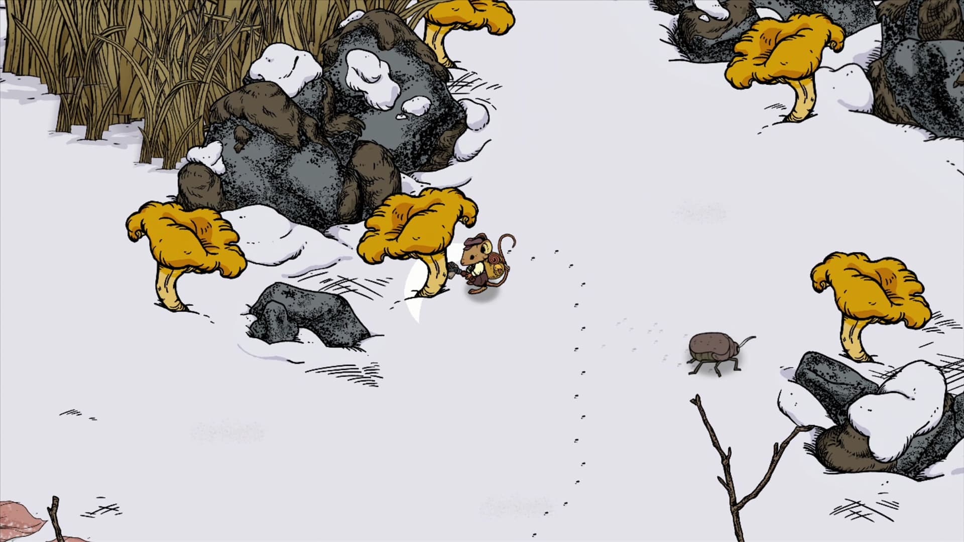 Hoewel je dit allemaal in een rustig tempo kunt gaan doen, is Winter Burrow ook een survivalgame. Dat betekent dus dat je buiten moet waken voor de kou. Blijf je te lang buiten dan bevries je langzaamaan. In de avond is het nog kouder, dus gaat deze statistiek nog wat sneller omlaag. Je moet ook regelmatig wat eten, want je krijgt steeds honger. Buiten vind je gelukkig genoeg voedsel om je honger te kunnen stillen.