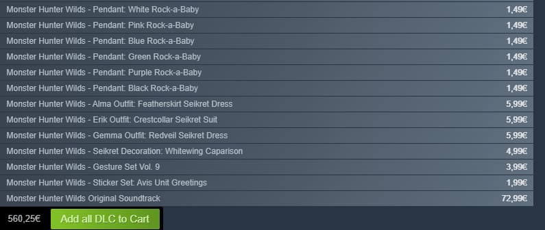 Zoals de meeste Capcom-spellen, heeft ook Monster Hunter Wilds een belachelijke hoeveelheid DLC. En mocht je denken: “Joh NWTV, DLC is van deze tijd, dus doe niet zo moeilijk”, dan piep je misschien wat anders wanneer we je vertellen dat het elf maanden oude spel 190 stukken DLC heeft. Dit betreft alles van stickers om je Hunter-badge mee te versieren tot en met kettinkjes voor je Palico en ga zo maar door.