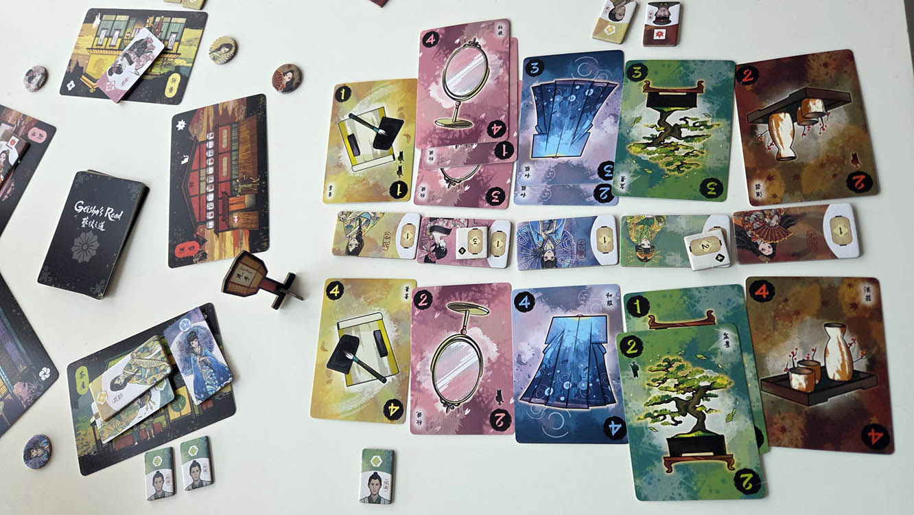 Je bent dus veel aan het puzzelen hoe je het beste gasten kan verzamelen, maar ook de hoogste punten kan krijgen voor je voorwerpen. Het is dus slim bekijken welke kaarten je in welke volgorde speelt en in welke theetuin de geisha zich op dat moment bevindt. Wanneer iemand vier van de vijf geisha’s weet te bemachtigen aan het einde van de ronde, wint die persoon het spel direct. Soms is het wel jammer dat het spel zo snel eindigt, omdat de punten die je verzameld hebt dan niks doen. Aan de andere kant is het wel een hele overwinning als het je in een ronde lukt om vier geisha’s te scoren! Wanneer dit niet het geval is, worden er twee rondes gespeeld en wordt er gekeken naar wie de meeste punten heeft behaald.